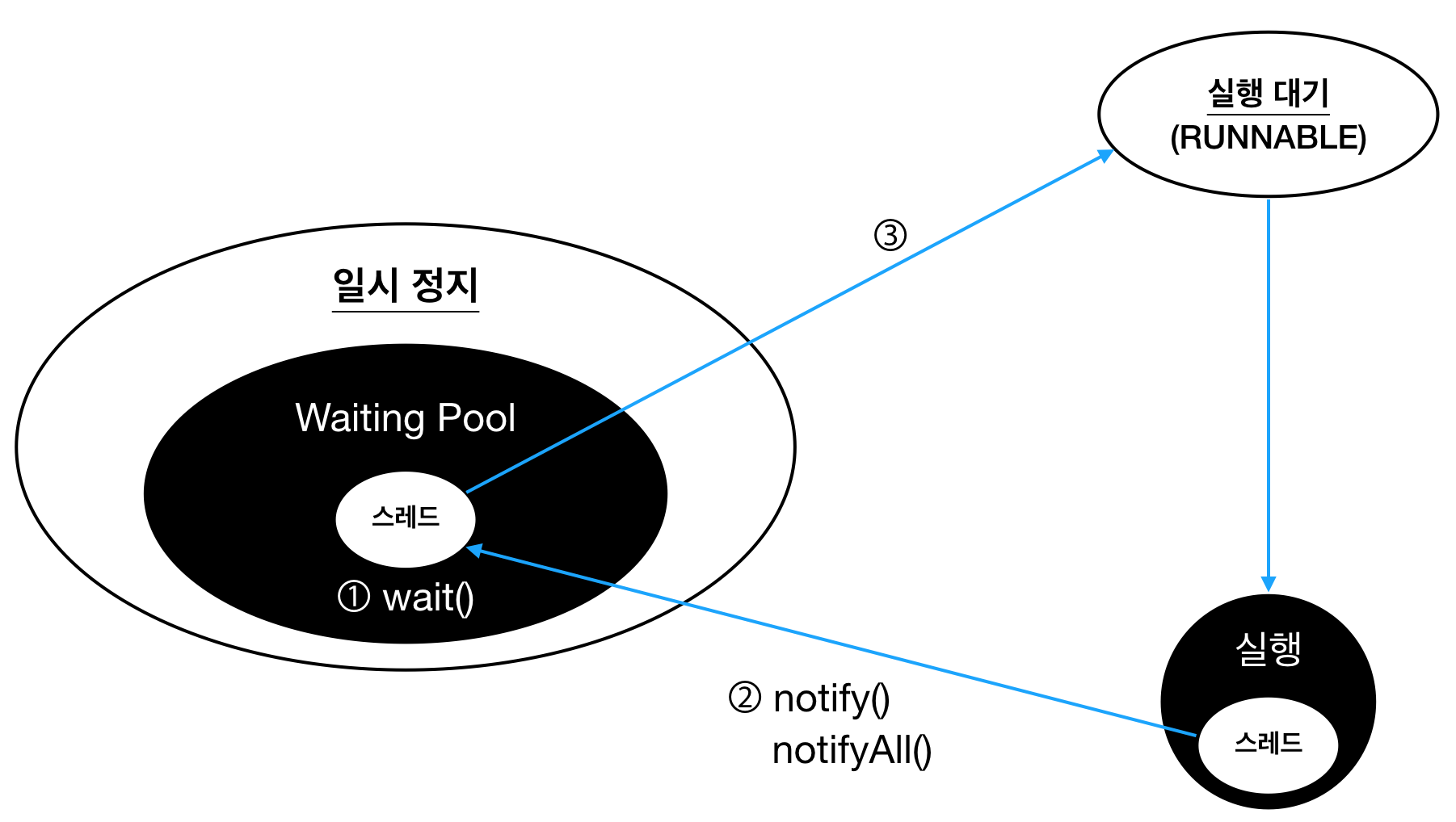 주의 점은 이 메소드들은 동기화 메소드 또는 동기화 블록 내에서만 사용할 수 있다고 합니다.